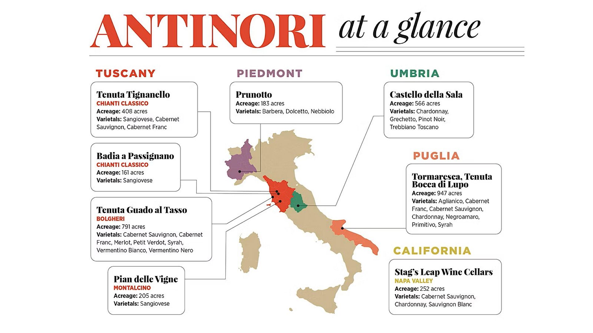 Od prevzatia kontroly nad vinárstvom v roku 1966, Piero Antinori vybudoval rozsiahle impérium, ktoré sa sústredilo najmä na Toskánsko. Za polstoročie premenil tento toskánsky aristokrat obchod s vínom na spoločnosť ovládajúcu viac ako 7000 akrov viníc. Popri tom bol jedným z malej skupiny, ktorá celkovo zmenila tvár toskánskeho a celkovo talianskeho vína a presunula zameranie vína z kvantity na kvalitu.