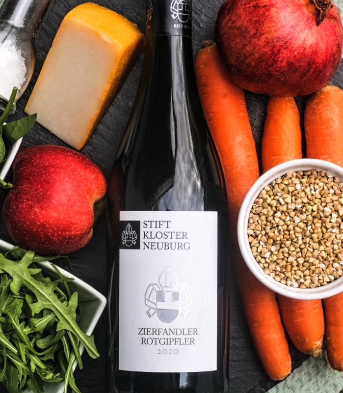 K teplému šalátu z pohánky s pečenou mrkvou, jablkom a kozím syrom odporúčam biele víno Stift Klosterneuburg Zierfandler-Rotgipfler Gumpoldskirchen 2020. Pohánka je neutrálna, dominantná je sladšia chuť mrkvy a kozieho syru. Toto víno má plnú, jemne sladšiu chuť, podporenú šťavnatou kyselinkou. Tá osvieži sladkosť pečenej mrkvy a jablka a podporí chuť kozieho syra.