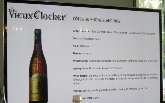 Prvým vínom v rámci Masterclass je Côtes du Rhône Vieux Clocher 2022. Základ tvorí Grenache Blanc (50%), doplnené odrodami Viognier (30%), Clairette (15%) a 5% Roussanne. Zber hrozna je ručný. Tradičná vinifikácia v nerezových tankoch, každá odroda je vinifikovaná samostatne. Tri mesiace na jemných kaloch a po 6 mesiacoch je víno plnené do fliaš. Diskrétna, mladá vôňa citrusového ovocia, kvitnúceho agátu a púpavy. V chuti stredne plné, svieže s dotykom horkej mandle. „Crispy“ kyselinka a jemne krémová textúra. Klasický štýl bieleho vína z Rhôny. Výborné do gastronómie.